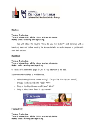 This document outlines a lesson plan for a 5th grade English class in Santa Rosa, Argentina. The 45-minute lesson focuses on places in the city. It includes routines, warm-up activities, and four main activities: 1) identifying likes about their city, 2) reading sentences about places and marking true/false, 3) identifying the common word in sample sentences, and 4) listening to a text about Santa Rosa and marking statements as true or false. The lesson aims to teach vocabulary for places in a city and use of prepositions like "in", "on", and "at".