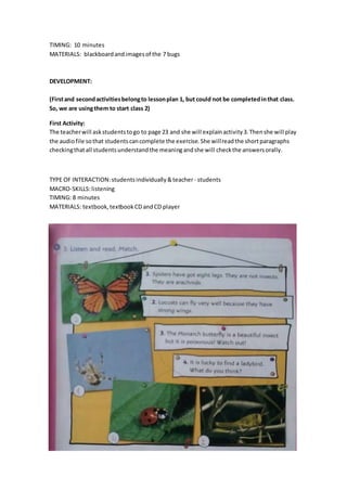 The lesson plan summarizes a 5th grade English lesson about bugs and numbers. The lesson includes activities to review vocabulary about common bugs, count to 100, and practice the grammatical structures "there is/are" and "how many x are there?" using examples of bugs. The plan outlines 5 activities including a warm up game identifying flashcards of bugs, completing exercises in the textbook about bugs and numbers, explaining grammatical structures, reading numbers aloud, and practicing question forms. The class will end by assigning homework using "there is/are" to describe bugs.