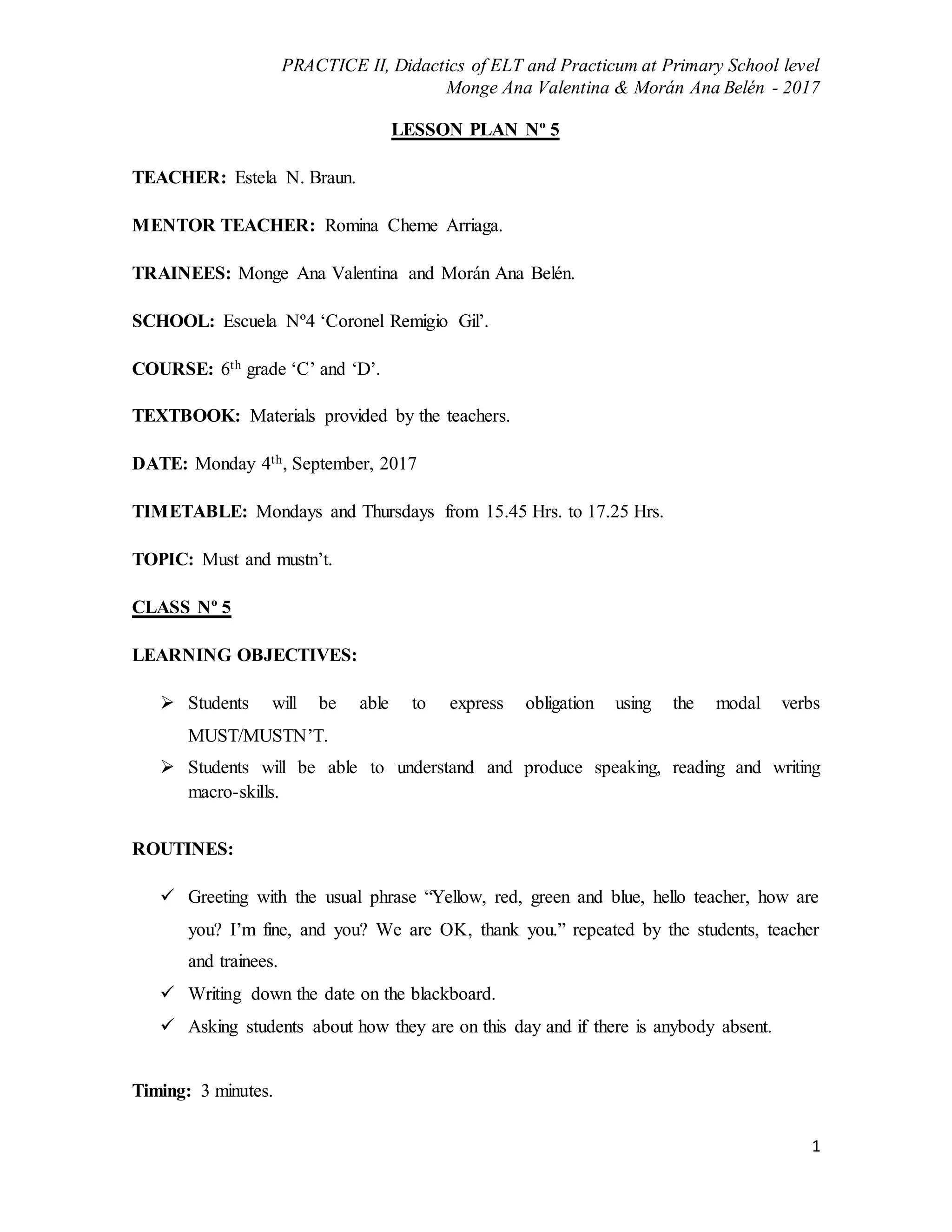 The document provides a lesson plan for a 6th grade English class. The lesson plan aims to teach students about the modal verbs "must" and "mustn't" to express obligation. It includes warm-up, development, and closing activities. For the warm-up, students will discuss rights and responsibilities. In the development, students will first match rights with responsibilities, then work in pairs writing classroom rules using "must" and "mustn't". To close, students will share their work from the paired activity.