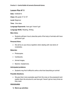 This lesson plan aims to teach 6th grade students how to describe parts of animal bodies using "have got/haven't got". The plan includes warm-up activities like reviewing vocabulary from the previous lesson and watching a video clip showing various animals. The main activity is using a PowerPoint to model descriptions of 3 animals using "have got/haven't got", then having students write their own description of an animal from the video. Materials include photocopies, images, and a projector. Potential issues are addressed, such as helping students who struggle to write the descriptions.