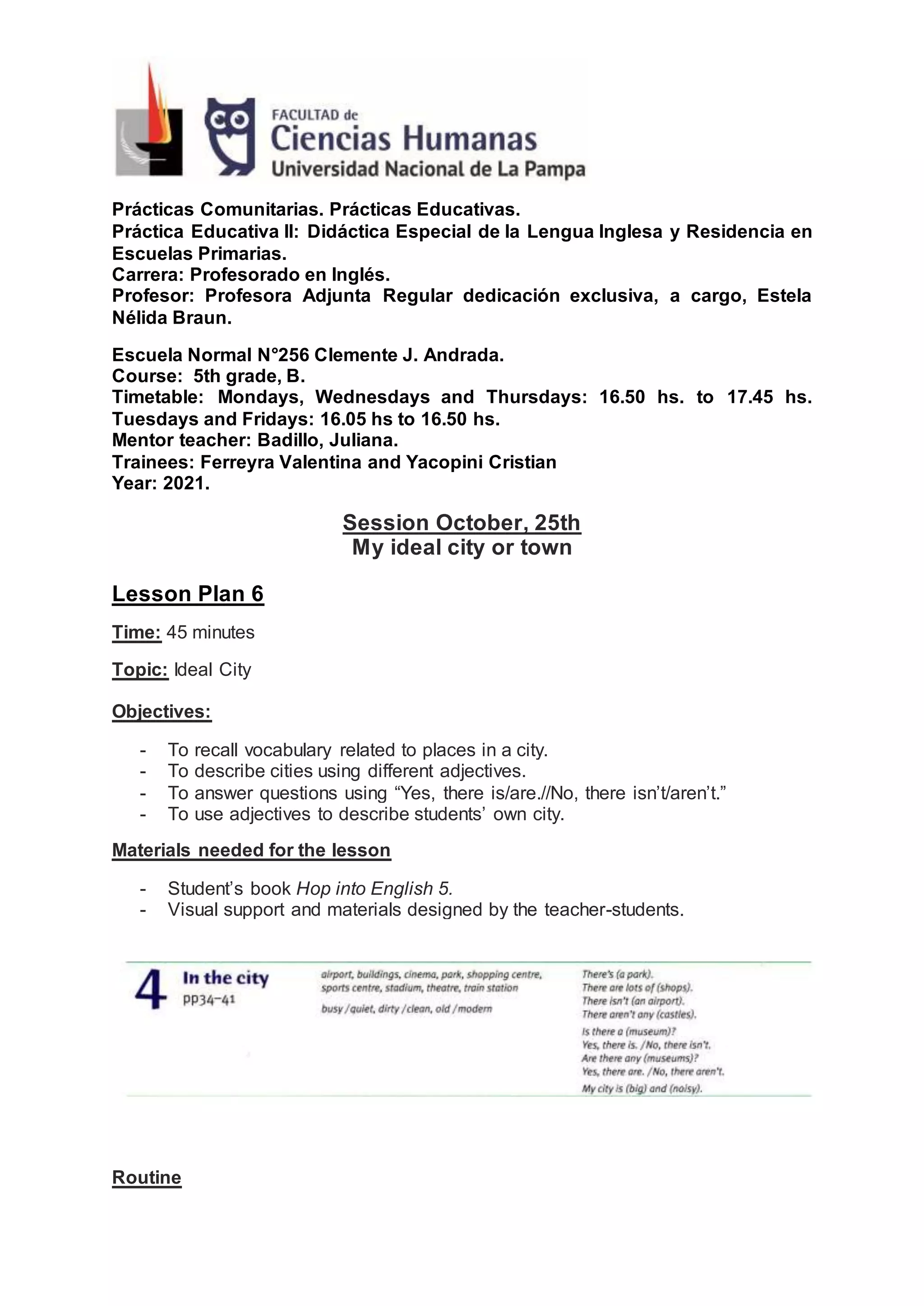 This document outlines a lesson plan for a 5th grade English class. The 45-minute lesson's objectives are to review vocabulary related to places in a city, describe cities using adjectives, answer questions using "Yes, there is/are" or "No, there isn't/aren't", and describe students' own cities using adjectives. The lesson includes warm-up activities, reading and listening exercises from the student book, an individual/class activity to match descriptions to cities, and a closing listening activity where students share their favorite city. Homework includes finishing exercises from the book and bringing art/project supplies for the next class.