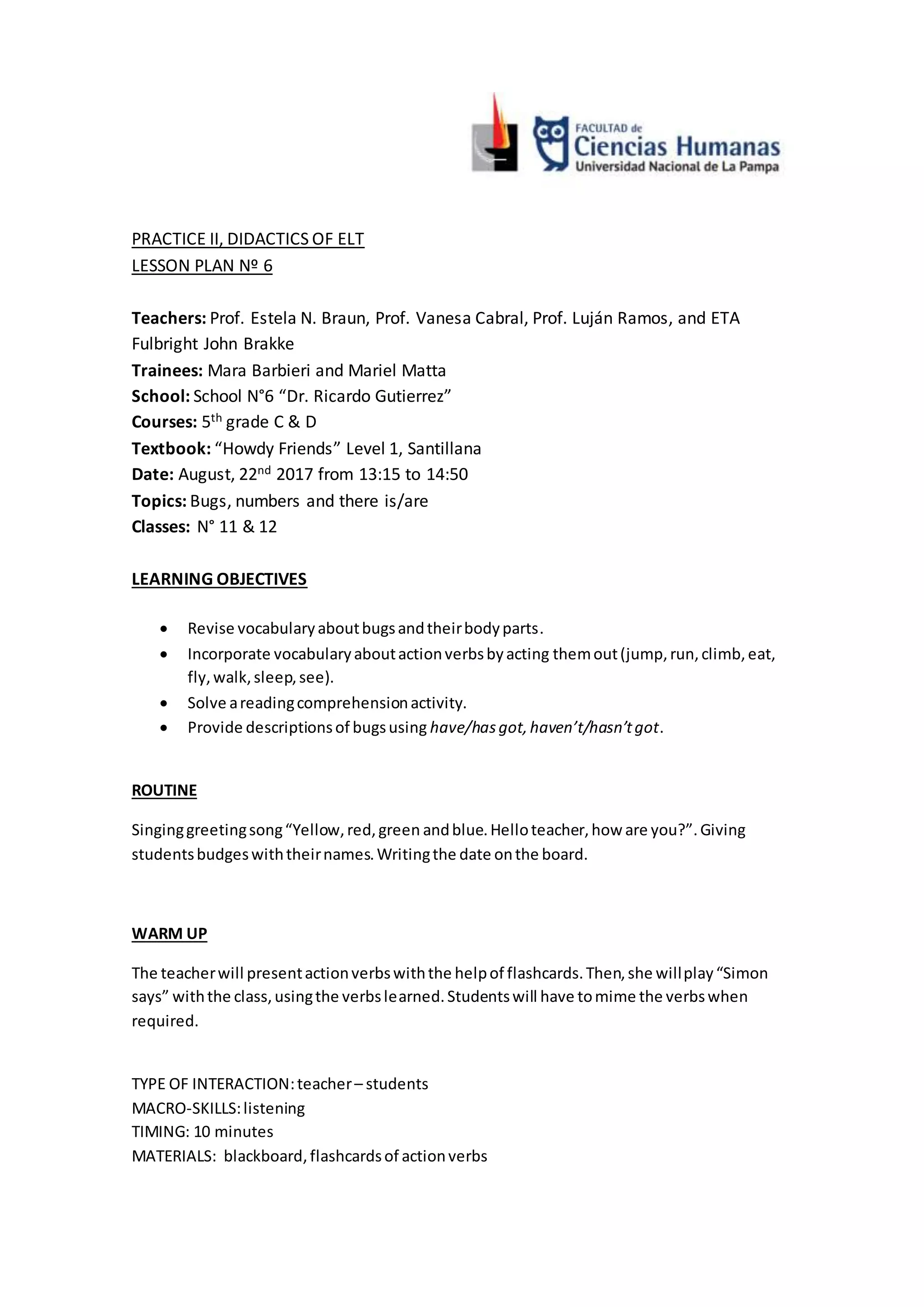 This lesson plan is for 5th grade English classes and focuses on teaching vocabulary about bugs, numbers, and the verbs "is" and "are". The plan includes 4 activities: 1) Reviewing homework vocabulary words, 2) Reading passages and completing a true/false activity about bugs, 3) Working in pairs to complete an exercise from the textbook, 4) Continuing to work in pairs on exercises practicing "have/has got". Throughout the lesson the teachers will check student work, announce an upcoming test, and assign homework.