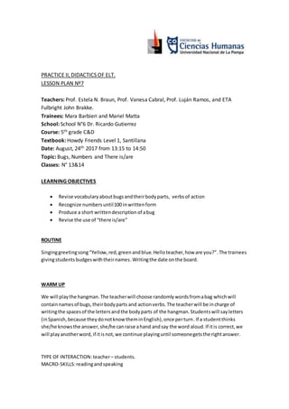 This document outlines a lesson plan for a 5th grade English class focusing on vocabulary related to bugs, numbers, and the grammatical structures 'there is/are'. It includes objectives, activity timings, materials needed, and types of student-teacher interaction. The plan features various activities aimed at reinforcing the learning objectives through reading, writing, and speaking exercises.