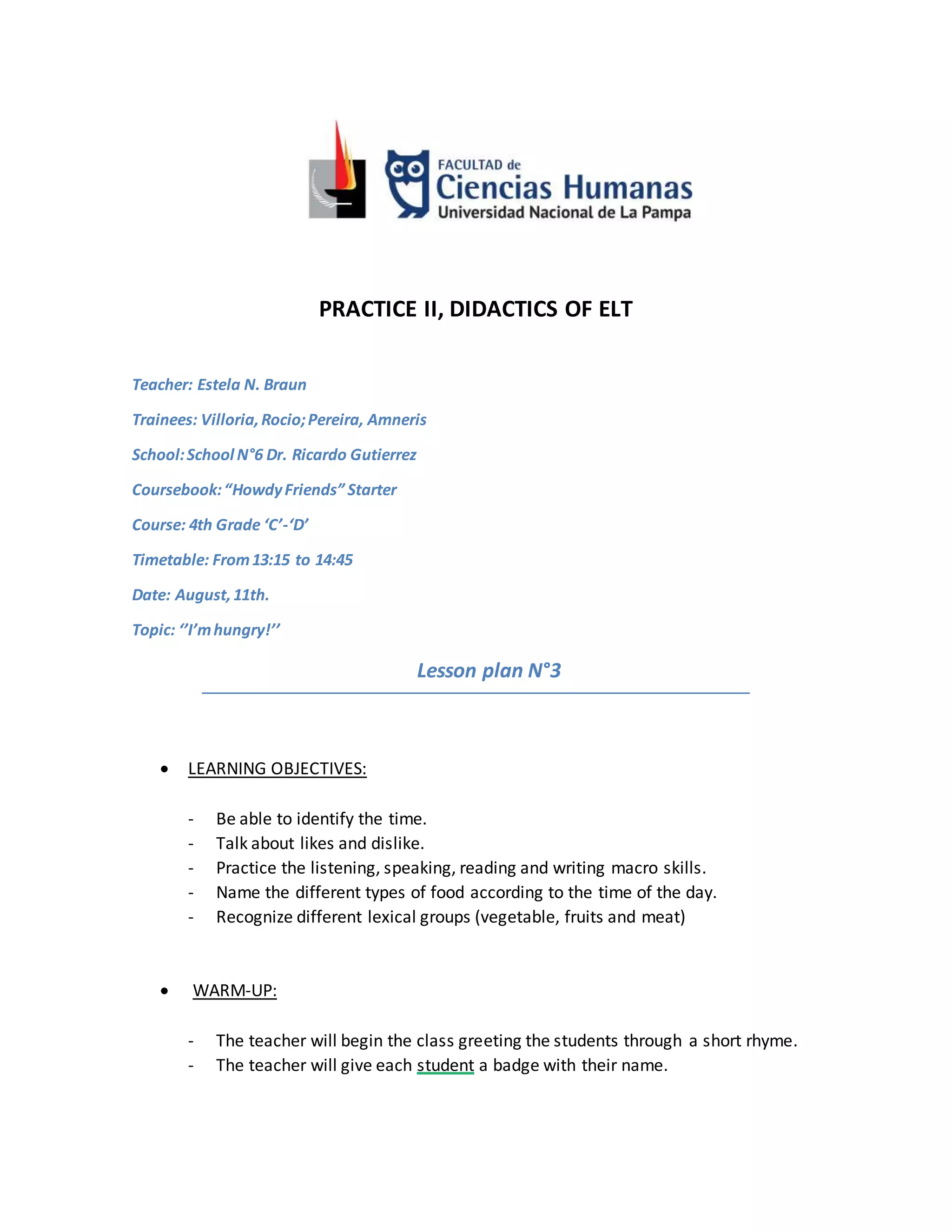 This document provides a lesson plan for an English language teaching class. The lesson plan aims to teach 4th grade students about food, mealtimes, and telling time. The plan includes three activities - listening and reading about meals, writing and singing about liked foods, and completing sentences about time and food. The activities focus on identifying food and time vocabulary, as well as practicing speaking, listening, reading and writing skills. The lesson uses the textbook "HowdyFriends" Starter and additional materials like flashcards and photocopies.