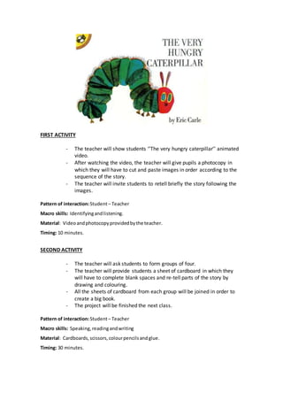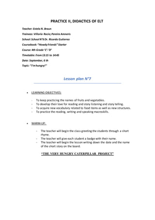 The document contains a lesson plan for a 4th grade English class focusing on food vocabulary. The plan has two activities - in the first, students will watch a video and retell the story of "The Very Hungry Caterpillar". In the second activity, students will work in groups to complete and illustrate sentences from the story to create a class book. The lesson aims to practice reading, writing, speaking and food vocabulary.