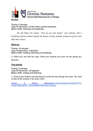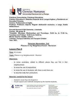 This document outlines a lesson plan for a 5th grade English class focusing on revising vocabulary related to places in neighborhoods. The 45-minute lesson includes a warm-up where students describe places in drawings, an activity having students guide a character through a maze of neighborhood places, another activity completing exercises in the student book, and a closing activity where students name and describe the city of a character. The plan aims to revise vocabulary, prepositions, and structures using "there is" and "there are" through listening, speaking, reading and writing exercises.
