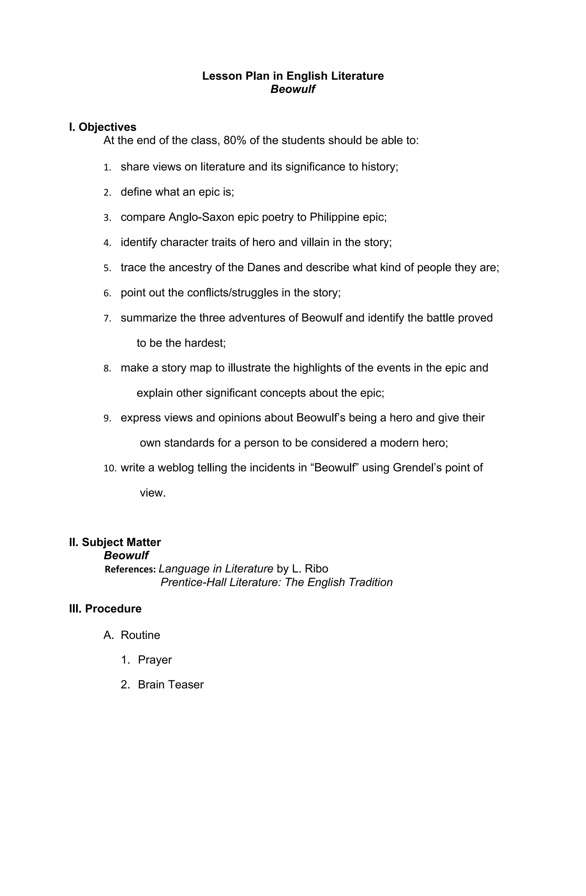This lesson plan introduces students to the epic poem Beowulf. It includes objectives for students to understand literary concepts like epics, identify character traits, summarize plot points, and analyze themes. The plan outlines activities like discussion questions, exercises to unlock difficult concepts, and an evaluation. Students will demonstrate their understanding by writing from Grendel's perspective and identifying heroic qualities for modern times.