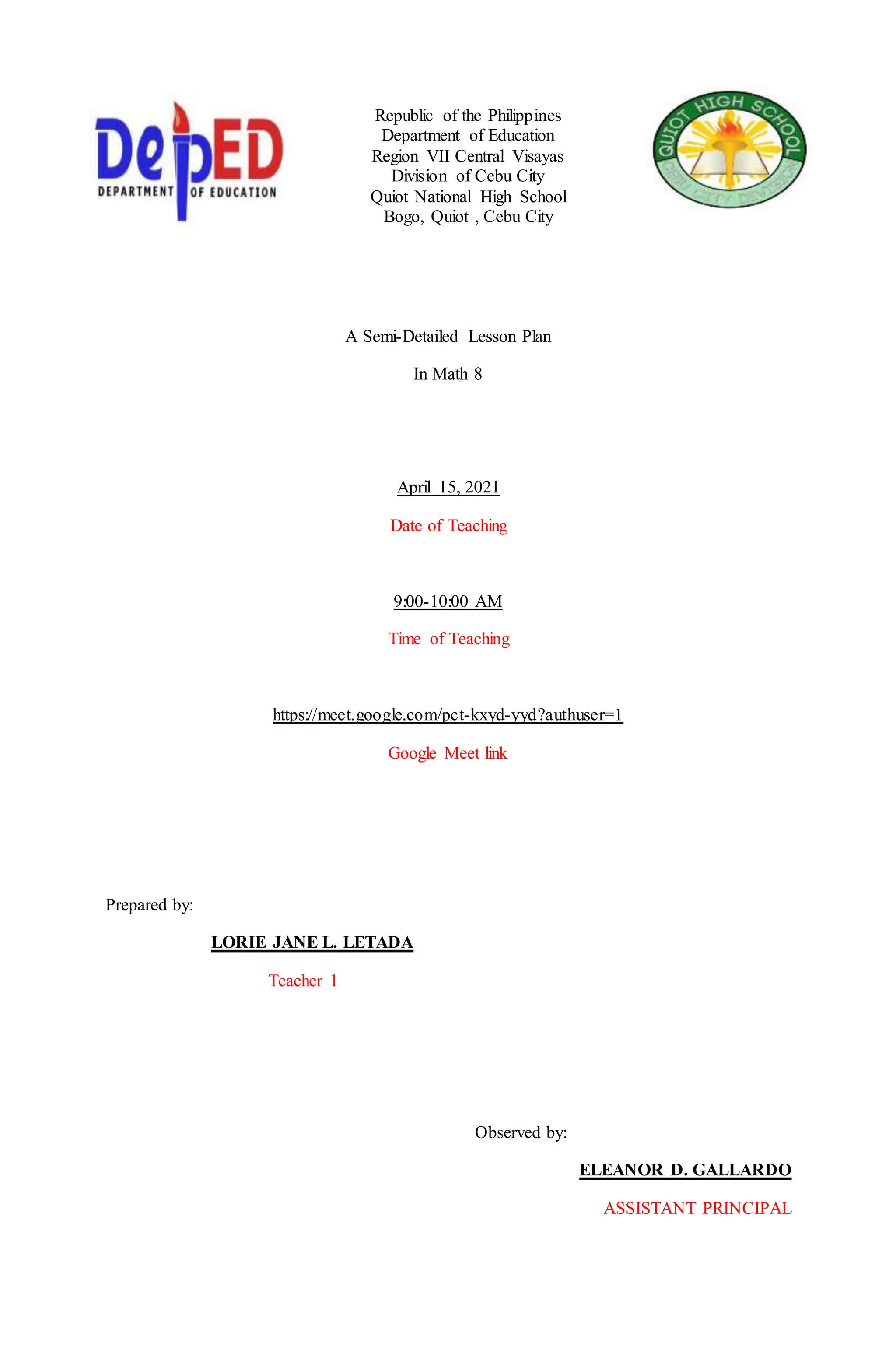 This document contains a semi-detailed lesson plan for a math class on linear inequalities in two variables. The lesson plan outlines intended learning outcomes, learning content including subject matter and reference materials, learning experiences including sample math word problems and explanations of key concepts, an evaluation through an online quiz, and an assignment for students to create a budget proposal applying their understanding of linear inequalities.