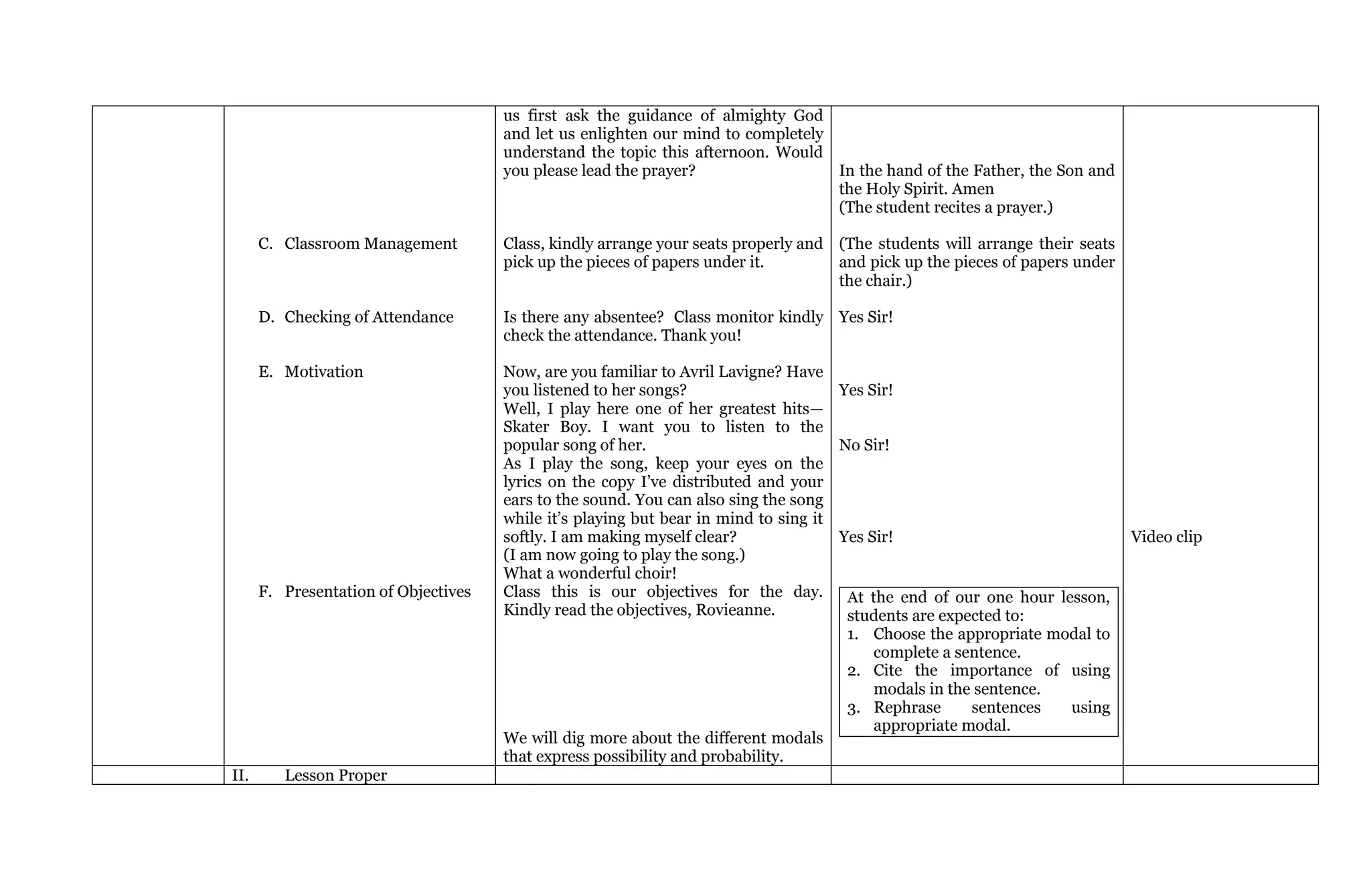 The document provides a detailed lesson plan for teaching modals to students. It includes objectives, topics, materials, and a step-by-step procedure. The procedure involves an opening activity to motivate students, presenting sample sentences with different modals to analyze their functions, and concluding with student understanding of modals like can, could, may, might, will, would, shall and should. The lesson aims to help students correctly use modals and understand their meanings.