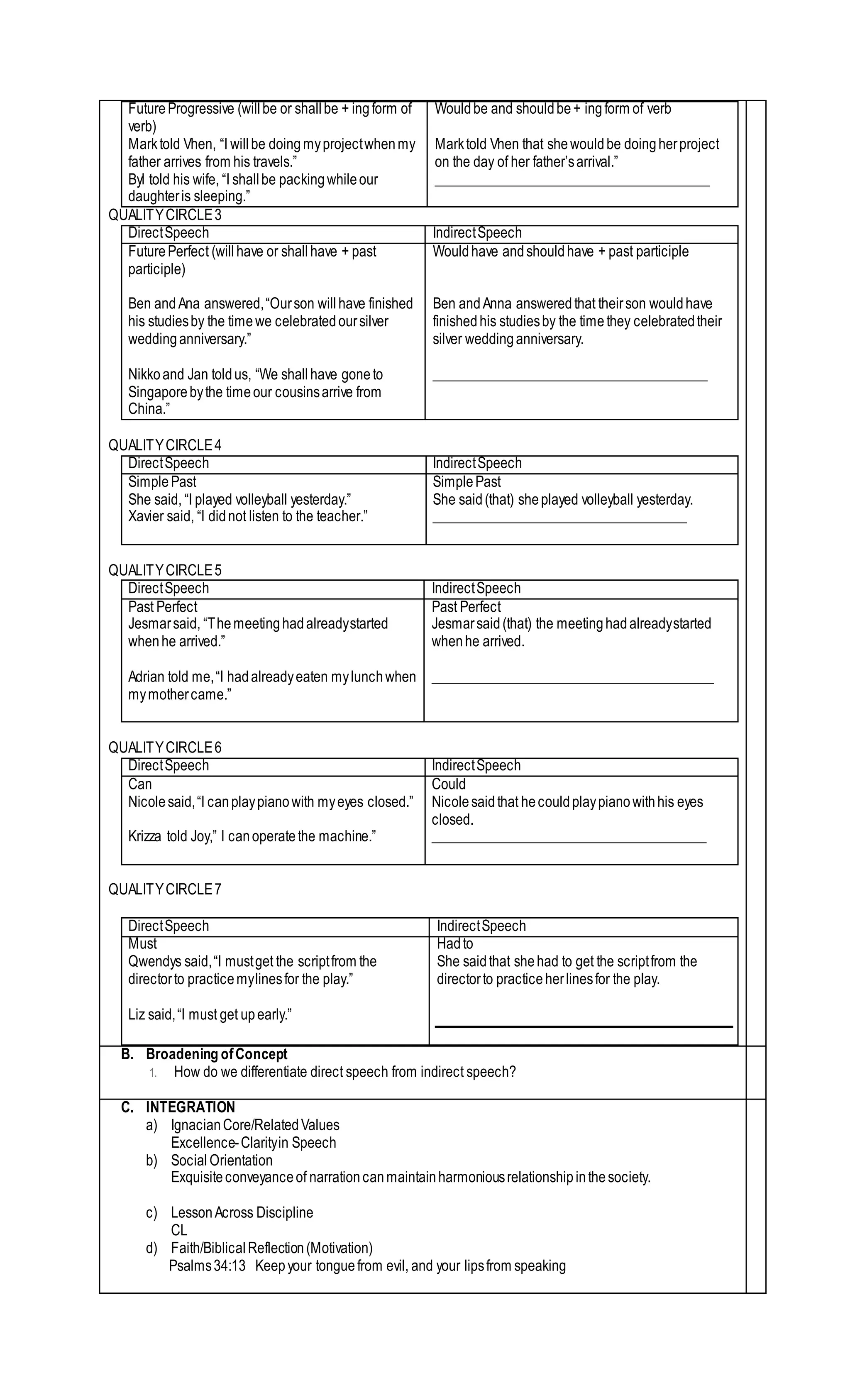 This document provides a student learning plan for an English 4 class that focuses on changing direct speech to reported speech, also known as indirect speech or narration. The lesson plan aims to help students understand the differences between direct and reported speech through examples and activities. Students will learn how to properly transform verb tenses and pronouns when changing direct quotations into indirect reported statements. This will help students more clearly relay what others have said.