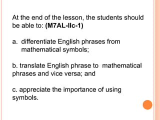 This document provides examples for translating between English phrases and mathematical expressions. It begins by outlining learning objectives around differentiating English phrases from mathematical symbols and translating between the two. Examples are then given for translating common terms like "sum," "multiplication," and others into mathematical symbols. Students practice translating phrases involving operations, variables, and order of operations. Key terms for translation are defined. Overall, the document aims to help students learn the relationship between verbal descriptions of mathematical concepts and their symbolic representations.