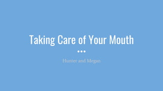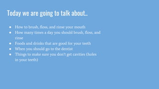 The document discusses proper oral hygiene, including brushing teeth twice a day using a smear of toothpaste and circular motions, flossing once a day by curving floss around each tooth in a C shape, visiting the dentist every 6 months or when something feels wrong, and using fluoride toothpaste, mouthwash, and treatments to prevent cavities and keep teeth strong. It also mentions nutrition and a Blippi toothbrushing song for kids.