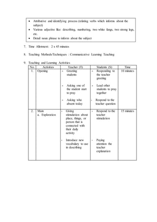 This lesson plan is for a 10th grade English class at SMA Negeri 11 Samarinda. Over two class periods, students will learn about descriptive texts by identifying their generic structure and linguistic features. They will practice describing people's appearances in pairs using simple present tense and specific vocabulary. The teacher will provide examples and feedback. By the end, students should be able to write a 10 sentence descriptive paragraph using correct spelling, readability, language appropriateness, and vocabulary. Student work will be assessed using a rubric focusing on these areas.