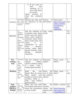 This lesson plan focuses on teaching British and American slang terms through various activities. Students will learn new slang words, practice them in sample dialogues, read a text about how young Brits speak slang, and listen to a song by Lil Dicky to identify slang terms. They will also have the opportunity to compose their own dialogues using slang words and discuss agreeing or disagreeing in speech if time allows. The 50-minute lesson involves warm-up discussion, presentations, readings, exercises and a listening activity to engage students in actively learning and using slang terminology.