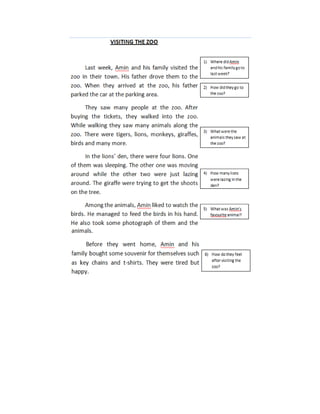 - Comprehension questions ask about the student's zoo trip and animals seen, while rearranging activities practice forming sentences from scrambled words.
