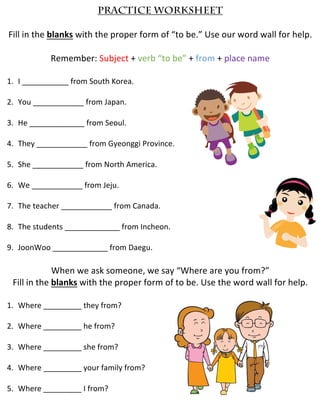 The document is a practice worksheet that asks students to fill in blanks with the proper form of "to be" to indicate where someone is from. It provides examples like "I am from South Korea" and asks students to complete sentences about being from various places in Korea. It also has students practice asking "Where are you from?" by filling in blanks with the correct form of "to be".