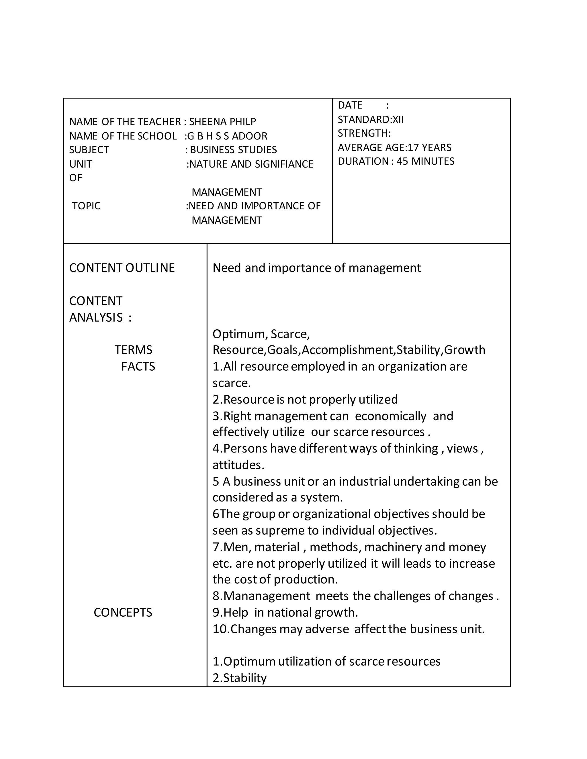 This document outlines a lesson plan for a business studies class on the need and importance of management. The lesson will be delivered to 12th standard students and last 45 minutes. It will begin with an introductory discussion on whether management is needed in organizations and why. The teacher will then explain the key points through examples, photographs, and relating it to students' prior knowledge from the first chapter. These key points are the optimal utilization of scarce resources, accomplishing group goals, stability, and contributing to national growth. The lesson will conclude by having a student summarize the main points and asking review questions to check understanding.