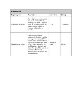 This lesson plan is for a 40-minute elementary level class on clothes for 21 5th year students. The main aims are for students to be able to name and describe pieces of clothing. The class will continue working on a clothing project divided into seasonal groups. Students will finish decorating images and write descriptive sentences about the clothes to prepare for an oral presentation next class.