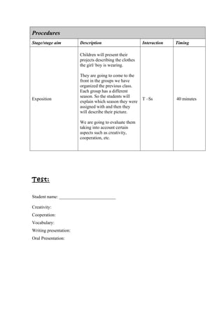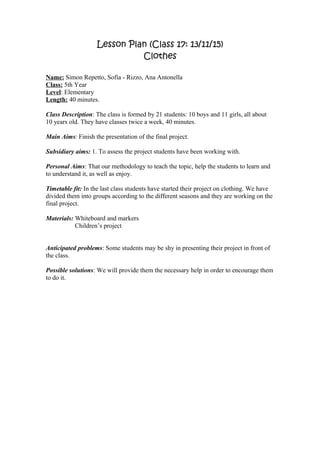 The lesson plan is for a 5th year elementary class of 21 students who will be finishing and presenting their final project on clothing. The main goal is to assess the clothing projects the students have been working on in groups based on different seasons. Each group will come to the front of the class to describe the clothes being worn in their seasonal picture. The teacher anticipates some students may be shy presenting but will provide encouragement. Students will be evaluated on their creativity, cooperation, vocabulary, and oral and written presentation skills.