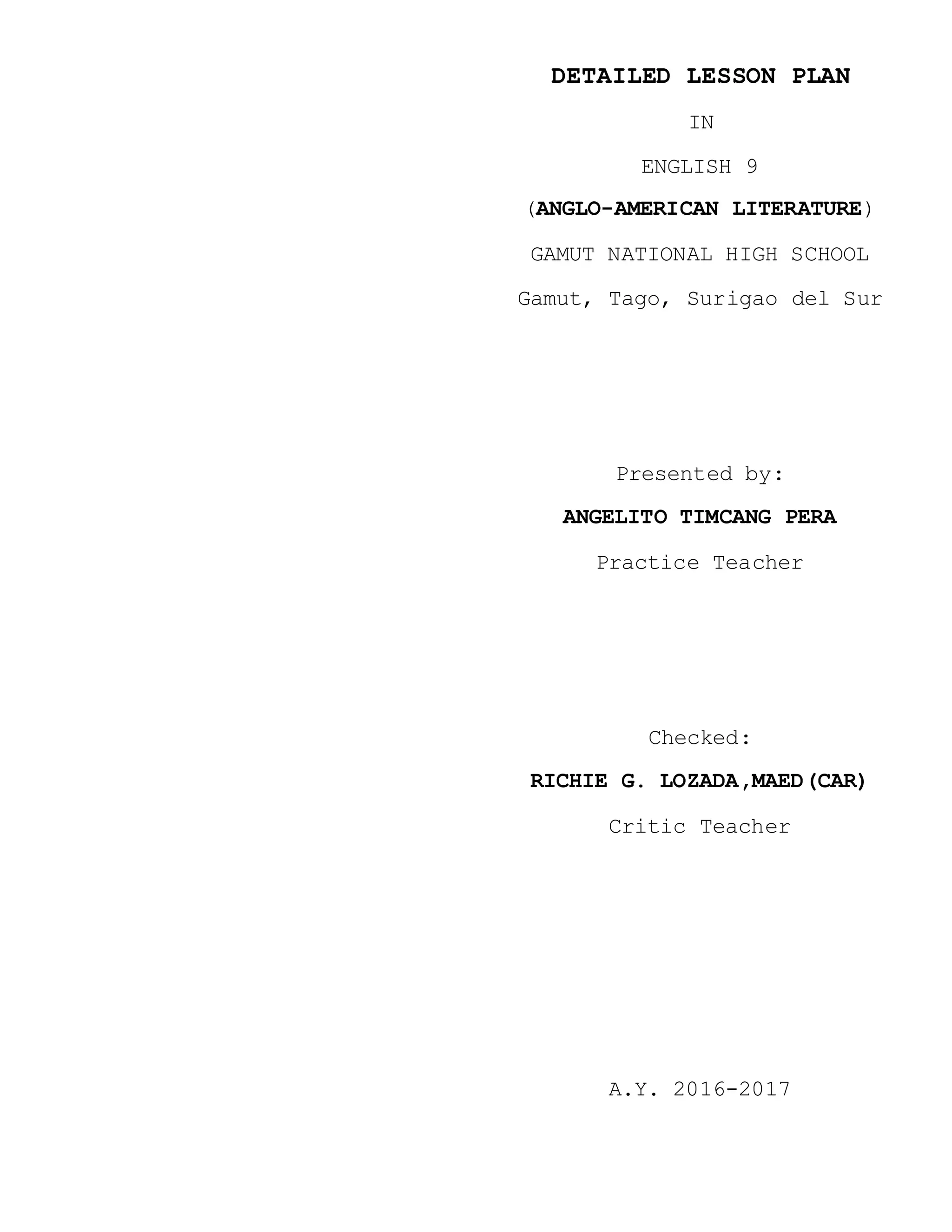 This document provides a detailed lesson plan for a 9th grade English class on Anglo-American literature. The plan covers figures of speech through classroom activities including identifying figures of speech in sample sentences, grouping common meanings for literal and figurative words, presenting on 15 figures of speech, and applying them through group activities like composing poems, songs, and role plays. Students will also complete individual assignments to identify figures of speech and research drama.