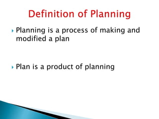 Planning is a process of creating and modifying plans to achieve goals such as developing sports performance, personality, and continued high performance. Effective planning involves dividing training into off-season, mid-season, and speed parts. Planning helps in a systematic way by establishing long-term training conceptions from 10-12 years divided into basic, advanced, and high performance stages and periodic planning from the macro cycle of yearly plans to the micro cycle of weekly plans. Planning must be based on talent, science, experience and aim to progressively improve education and performance.