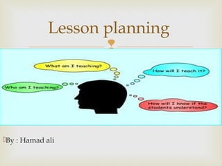 The document discusses the key components of effective lesson planning. It outlines the standard stages of a lesson as introduction, statement of aim, development, recapitulation, consolidation, and conclusion. Each stage is described in 1-2 sentences. For example, the introduction aims to focus student attention and link to their background knowledge, while the development presents content in a logical order using various teaching methods and aids. Effective lesson planning is emphasized as important for organizing instruction and achieving learning objectives.