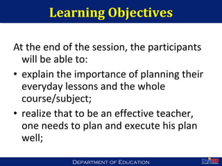 This document provides guidelines for daily lesson preparation in the Philippine Department of Education's K to 12 Basic Education Program. It outlines the importance of instructional planning and lesson preparation for ensuring effective teaching and learning. Teachers are required to complete either a Daily Lesson Log (DLL) or Detailed Lesson Plan (DLP) on a daily/weekly basis. New teachers and those teaching new content must complete a DLP. The DLL and DLP templates include objectives, content, resources, procedures, assessment, and reflection sections. Thorough lesson preparation is considered essential for teachers to facilitate learning, deliver quality education, and effectively manage instruction.