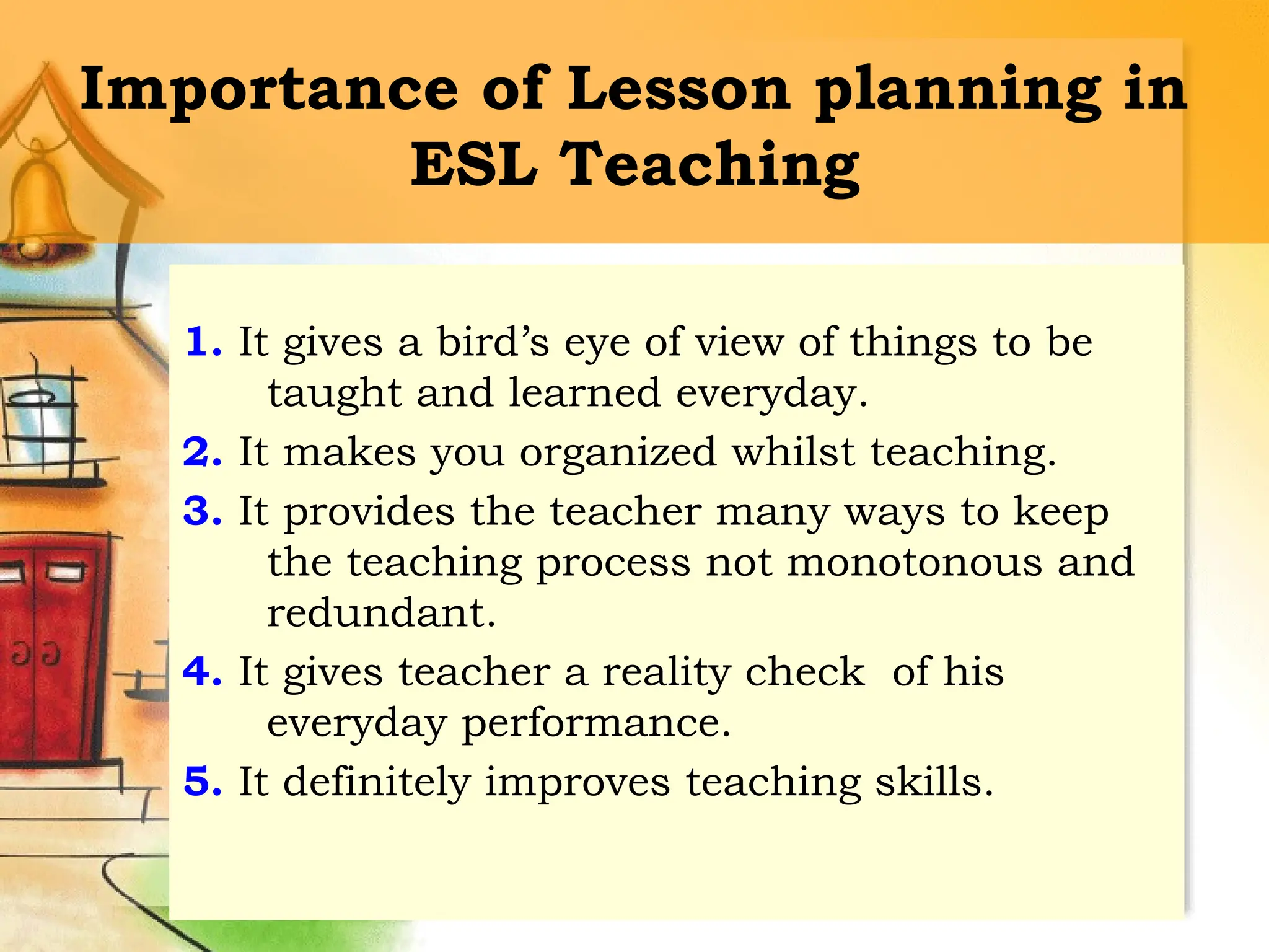 The document discusses the significance of lesson planning in ESL teaching, highlighting its role in organizing content, enhancing teaching efficiency, and improving student learning outcomes. It outlines the purpose, major elements, and characteristics of effective lesson plans, alongside their advantages such as saving time and boosting confidence. Additionally, it covers methods for writing lesson plans, setting educational objectives, and utilizing various teaching materials and resources.