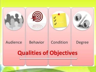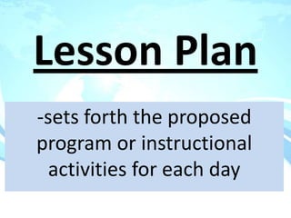 The document outlines the basic parts of a lesson plan including objectives, motivation, development, methods, materials, summaries, and assignments. It describes the components in detail, such as defining objectives using Bloom's taxonomy, examples of intrinsic and extrinsic motivation, and considerations for choosing instructional materials. Characteristics of effective assignments are provided like being interesting, incorporating previous lessons, and catering to individual differences.
