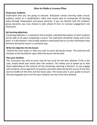 Lesson planning is a teacher's guide for what students need to learn, how it will be taught, and how learning will be measured. It helps teachers be more effective by providing a detailed outline to follow. Good lesson planning is essential for teaching and learning as it allows teachers to thoughtfully plan objectives, activities, sequencing, materials, timing, and grouping. A detailed lesson plan has five parts - objectives, subject matter, procedure, evaluation, and assignment. The first step in any lesson is effective lesson planning, which includes knowing your students, setting learning objectives, writing the lesson objective, and planning your timeline.