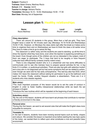The document provides details about an English lesson for a 3rd grade class in Spain. It includes information about the trainees, classroom, students, and lesson plan. The lesson aims to establish rules of conduct for a friendly learning environment through setting routines, matching phrases to pictures of behaviors, and a student questionnaire. The trainees anticipate that not all students may pay attention during presentations and that some students regularly argue or fight in class.