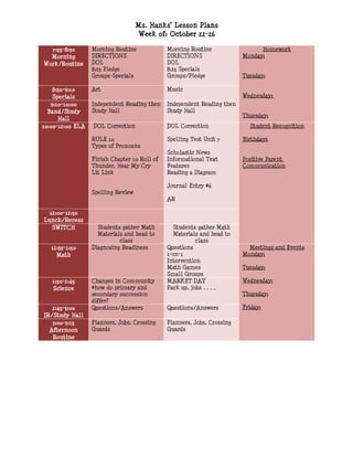 This document contains Ms. Hanks' lesson plans for the week of October 22-26. Each day includes a morning routine and schedule of classes like art, music, PE, ELA, math, science, and study hall/independent reading. Monday's ELA lesson focuses on analyzing sentences and chapters in Roll of Thunder, Hear My Cry. Tuesday includes spelling and grammar lessons. Wednesday has a character discussion and math assessment on integers and order of operations. Thursday reviews pronoun rules and finishes Roll of Thunder, Hear My Cry. Friday includes a spelling test, reading informational texts, and market day in science.
