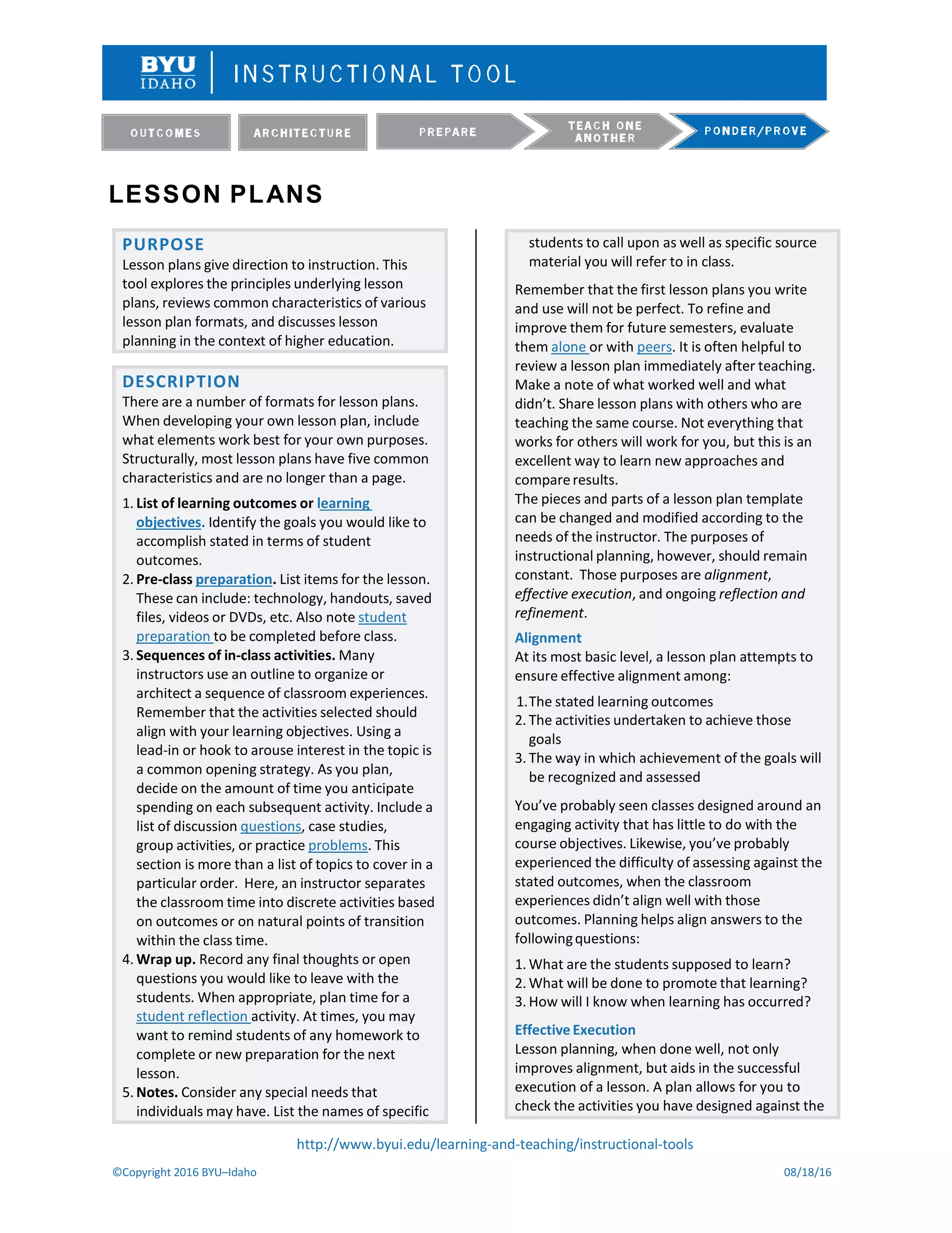 This document provides guidance on creating effective lesson plans. It discusses the key purposes of lesson plans as being alignment, effective execution, and ongoing reflection and refinement. It describes common elements of lesson plans such as learning objectives, pre-class preparation, in-class activities, and wrap-up. Lesson plans should align learning objectives, activities, and assessments and help ensure successful execution of lessons. They also allow instructors to reflect on lessons and improve them over time.