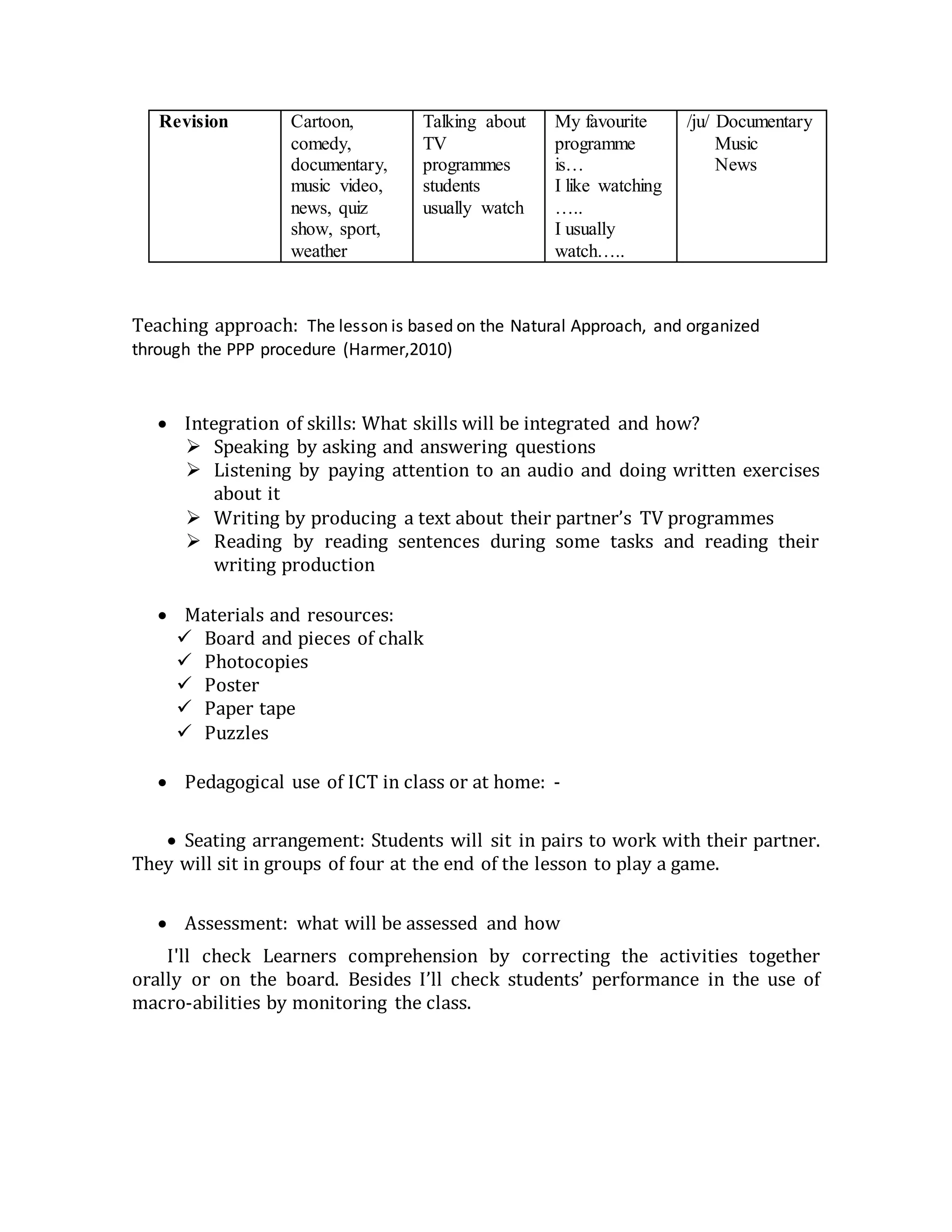 The document provides details of an English lesson plan for 6th grade students, including the aims to teach telling time using phrases like "o'clock", "quarter past", and "half past". The plan involves a warmup activity reviewing TV programs, a presentation teaching the new time phrases, and a development section where students listen to a dialogue and complete exercises practicing the target language. Skills integration, materials, seating arrangement, and assessment are also outlined.
