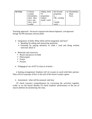 The document outlines a planned English lesson for 6th grade students on telling time. It includes the teaching objectives to have students identify times, talk about TV programs and when they watch them, and practice speaking, listening and reading skills. A variety of activities are outlined, including identifying times from a listening text, role playing asking about TV preferences, and a closing game to practice telling time.