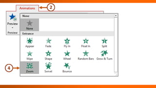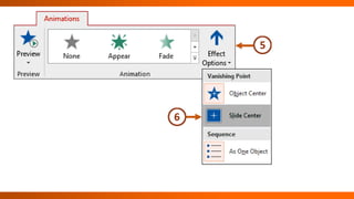 This document provides instructions for animating objects in a PowerPoint presentation using the Animations tab and Animation Pane. It describes how to apply animation effects, modify effect properties, adjust timing, and organize effects. Key steps include selecting objects, choosing effects from tabs and groups, setting durations and delays, reordering effects, and testing animations. The document also directs the reader to activities for practicing these animation skills.