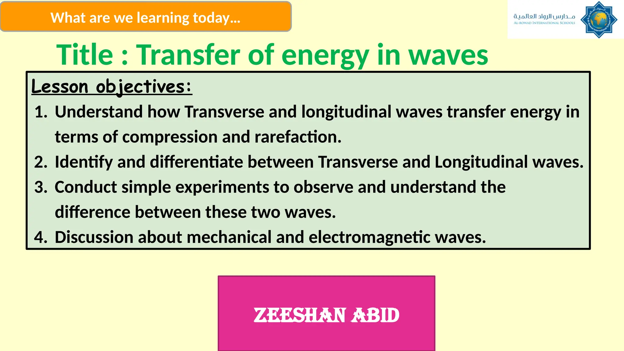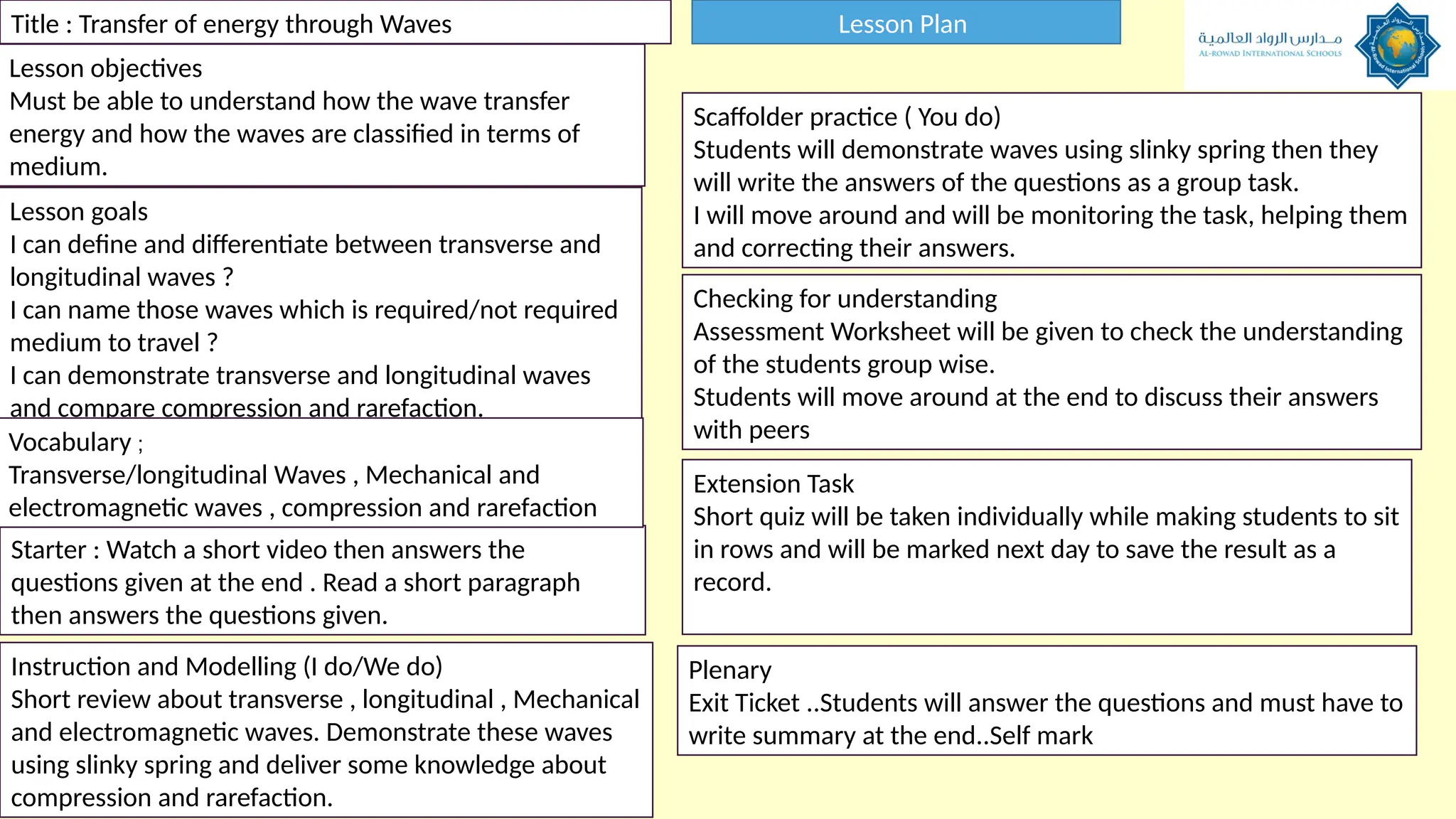 The document outlines a lesson plan focused on understanding the transfer of energy through waves, specifically transverse and longitudinal waves. It includes objectives for students to identify and differentiate these waves, conduct experiments, and engage in discussions about mechanical and electromagnetic waves. Various activities, such as video analysis, group tasks, and assessments, are incorporated to ensure comprehension and retention of concepts related to wave behavior and characteristics.