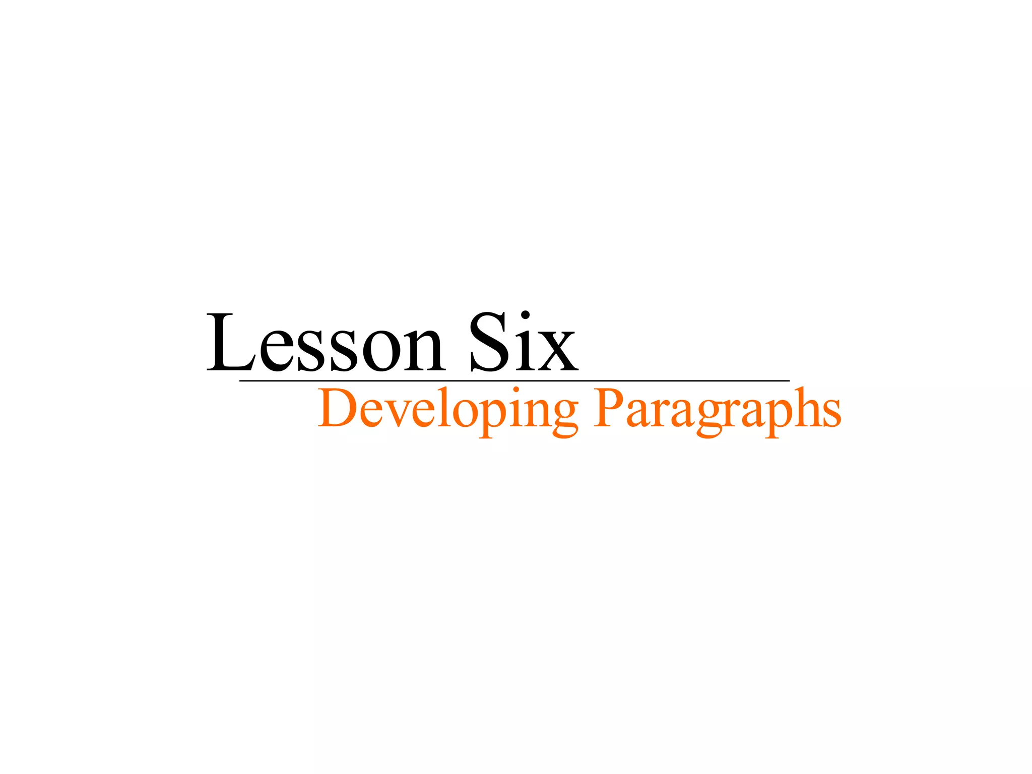 This document provides guidance on developing paragraphs, including the key elements of a paragraph and different methods for paragraph development such as using time, process, space, examples, comparison/contrast, cause/effect, and classification. It also includes examples of transitional words and phrases for each development method. The document concludes with writing assignments - to state, explain, and describe a social problem that can be fixed in one's lifetime, and to read the next chapter.