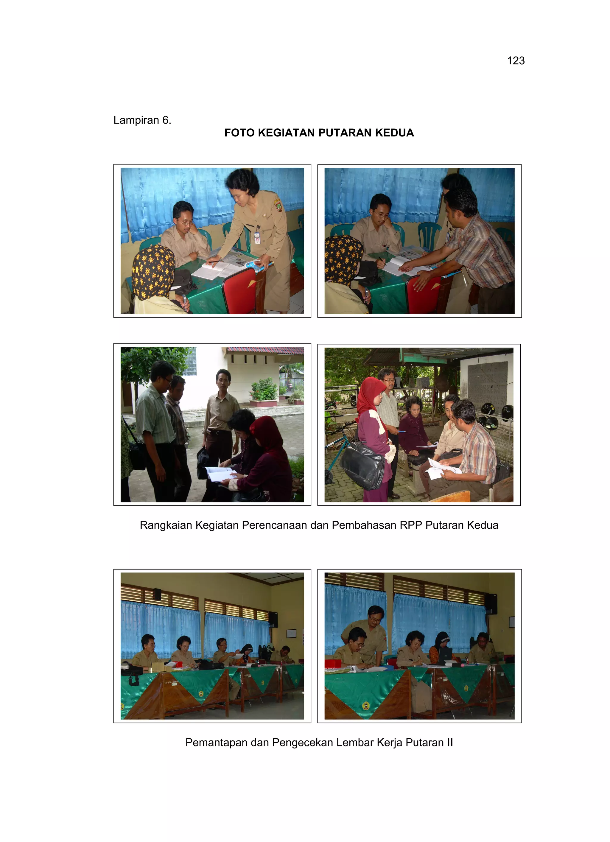 Dokumen ini berisi foto-foto kegiatan siswa dan guru dalam pelaksanaan RPP putaran kedua tentang jaring-jaring kubus dan balok, meliputi persiapan guru, diskusi siswa dalam kelompok, presentasi hasil diskusi, evaluasi, dan refleksi.