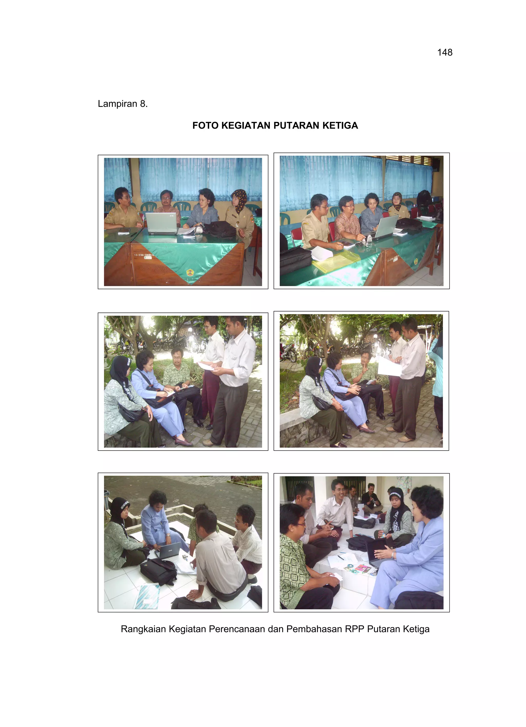 Dokumen ini berisi serangkaian foto kegiatan pembelajaran matematika putaran ketiga tentang prisma dan limas. Foto-foto tersebut meliputi kegiatan guru memberikan apersepsi, membagikan alat peraga dan LKS, diskusi kelompok siswa, presentasi hasil diskusi, tanggapan siswa terhadap presentasi, kesimpulan bersama, hasil karya siswa membuat jaring-jaring prisma dan limas, serta refleksi siswa.