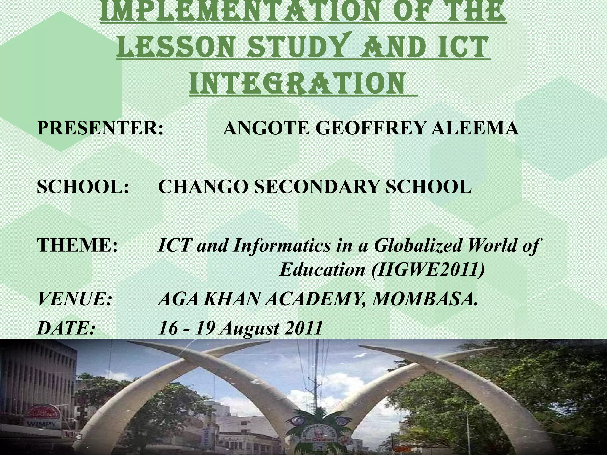The document outlines a presentation on the implementation of lesson study and ICT integration in Kenyan secondary schools, highlighting its objective to enhance teaching practices following the SMASSE project. It discusses the processes involved in lesson study, roles of stakeholders, encountered challenges, and the necessity for teachers to receive in-service training. Recommendations include improving supervision, increasing teacher participation, and incorporating mobile phones in schools to promote ICT in education.