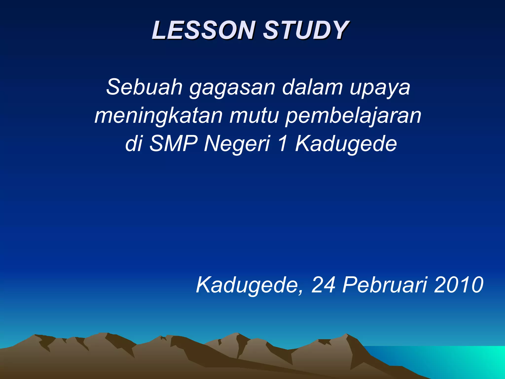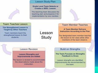 Lesson study adalah metode kolaboratif untuk meningkatkan kualitas pembelajaran di SMP Negeri 1 Kadugede dengan fokus pada pengamatan dan refleksi proses belajar mengajar. Dalam sistem ini, guru bekerja sama merencanakan, melaksanakan, dan mengamati pembelajaran untuk memahami cara siswa belajar dan mengembangkan pengetahuan pedagogis. Kegiatan ini juga berupaya membangun komunitas belajar dan meningkatkan keahlian mengajar melalui umpan balik dan dokumentasi kemajuan.