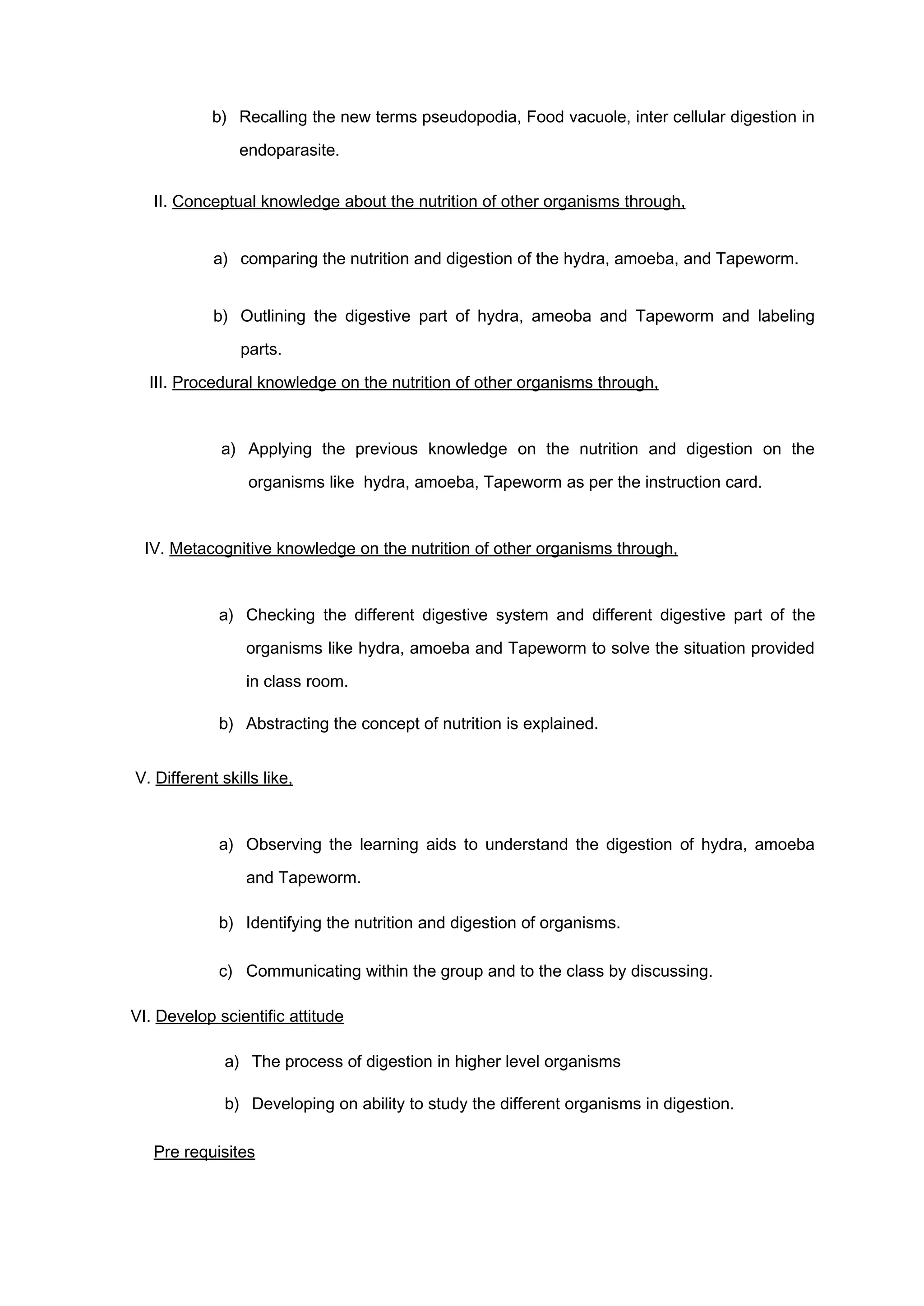 This document provides a lesson plan template for a biology class on the nutrition of other organisms. It includes details such as the teacher's name, school, subject, date, unit name, topic, and period. The plan aims to develop students' factual, conceptual, procedural, metacognitive and process skills regarding nutrition through group activities and questioning. Key terms and facts about the nutrition of hydra, amoeba and tapeworm are provided. The learning outcomes seek to have students develop knowledge in these areas through comparing different organisms, outlining and labeling digestive parts, applying knowledge to new situations, and developing scientific skills and attitudes. Teaching resources include power point presentations and activities to analyze nutrition in groups.