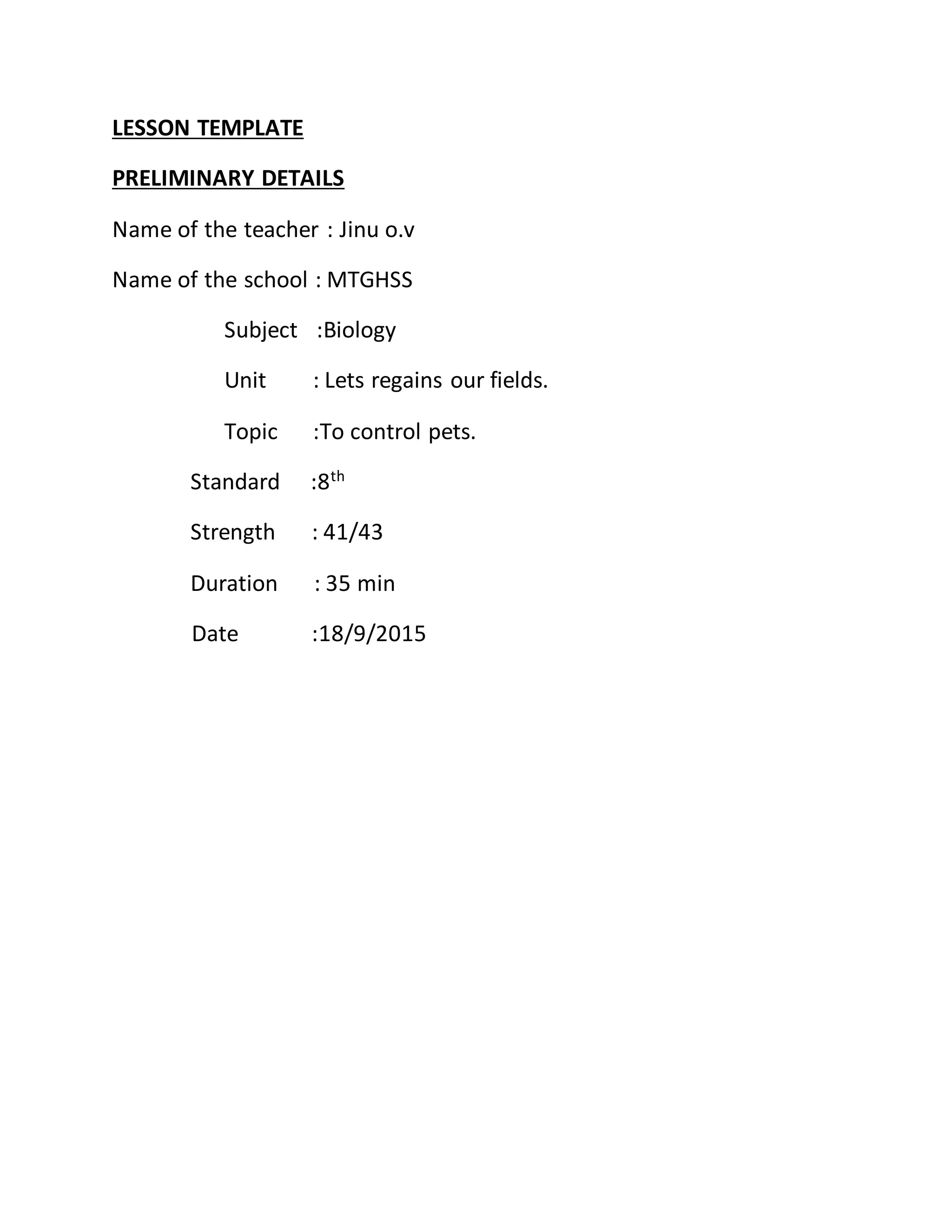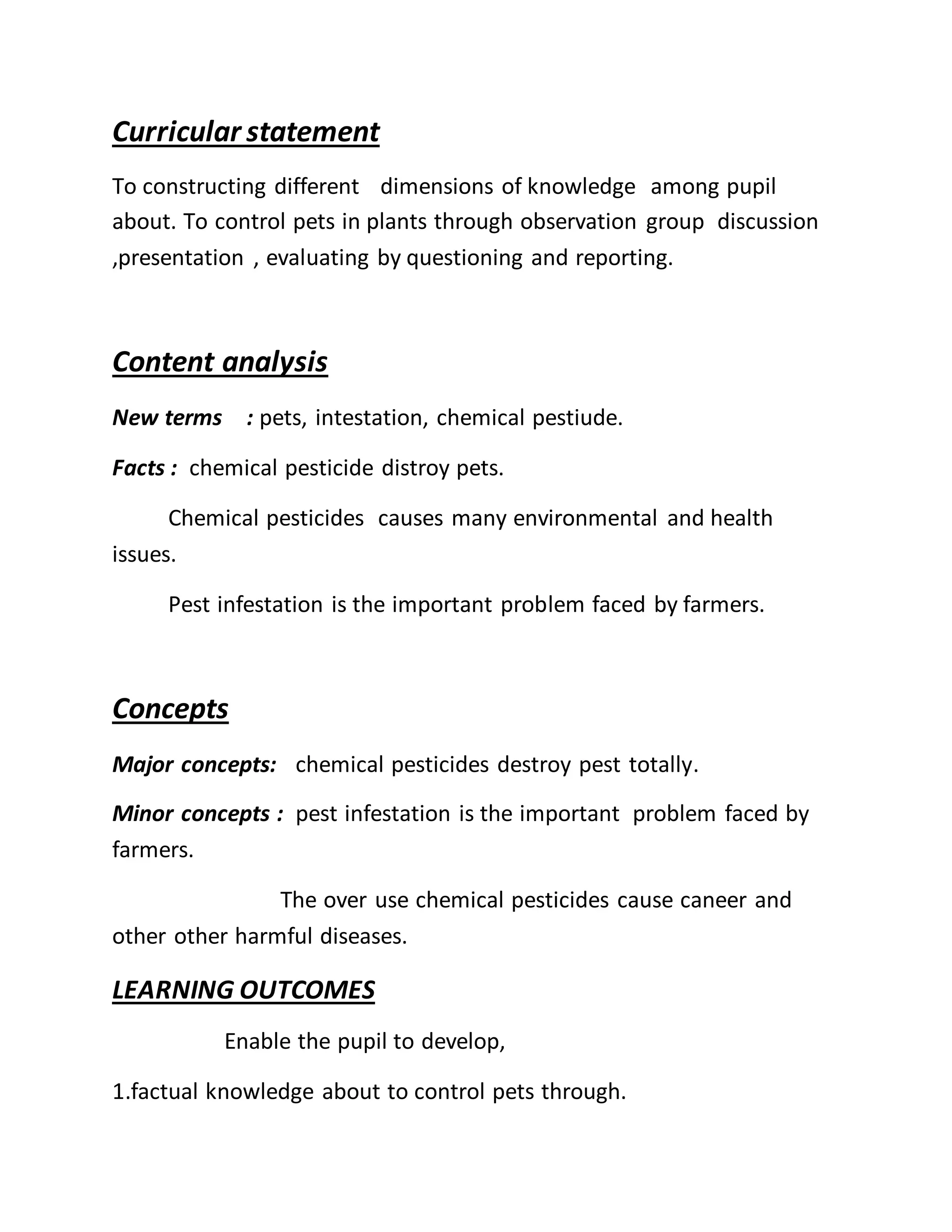 This lesson plan is for an 8th standard Biology class on controlling pests in plants. It outlines the learning objectives which are for students to develop factual, conceptual, and procedural knowledge about different pests that affect plants and how to control them. The lesson involves students observing pictures of pests, discussing in groups natural and chemical methods of pest control, and presenting on the impacts of chemical pesticides. Formative assessment questions review pest types, control methods, and effects of chemical fertilizers.