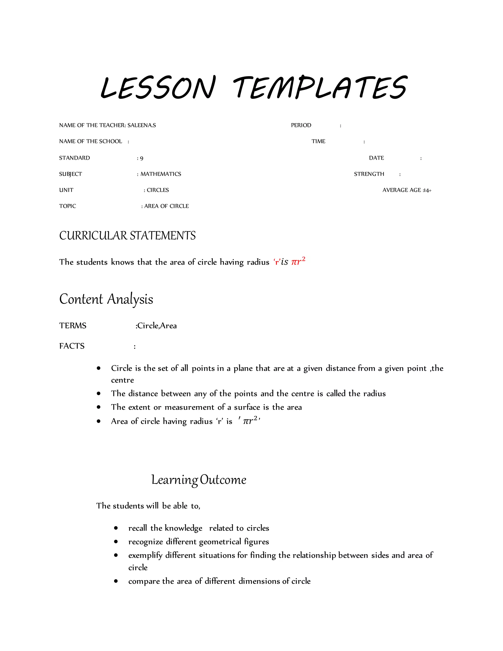 This lesson plan teaches students about the area of a circle. It begins with an introductory puzzle about circles and their properties. Students then work in groups to cut out circular shapes and arrange them to form other shapes like parallelograms. This allows them to discover that the area of a circle can be calculated using the formula Area = πr^2. The lesson concludes by having students practice calculating the area of circles using different radii.