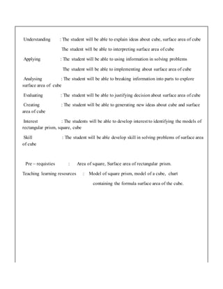 The document describes a lesson on teaching 8th grade students how to calculate the surface area of a cube. It includes: