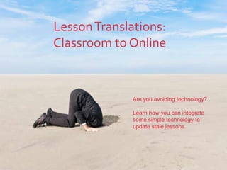 The document is a guide for teachers on integrating technology into lessons to enhance student engagement and learning experiences. It outlines various tools and methods, including comic/movie creators, maps, quizzes, blogs, wikis, and games that can revitalize stale lessons. The goal is to connect with students through different technological platforms while accommodating diverse learning styles.