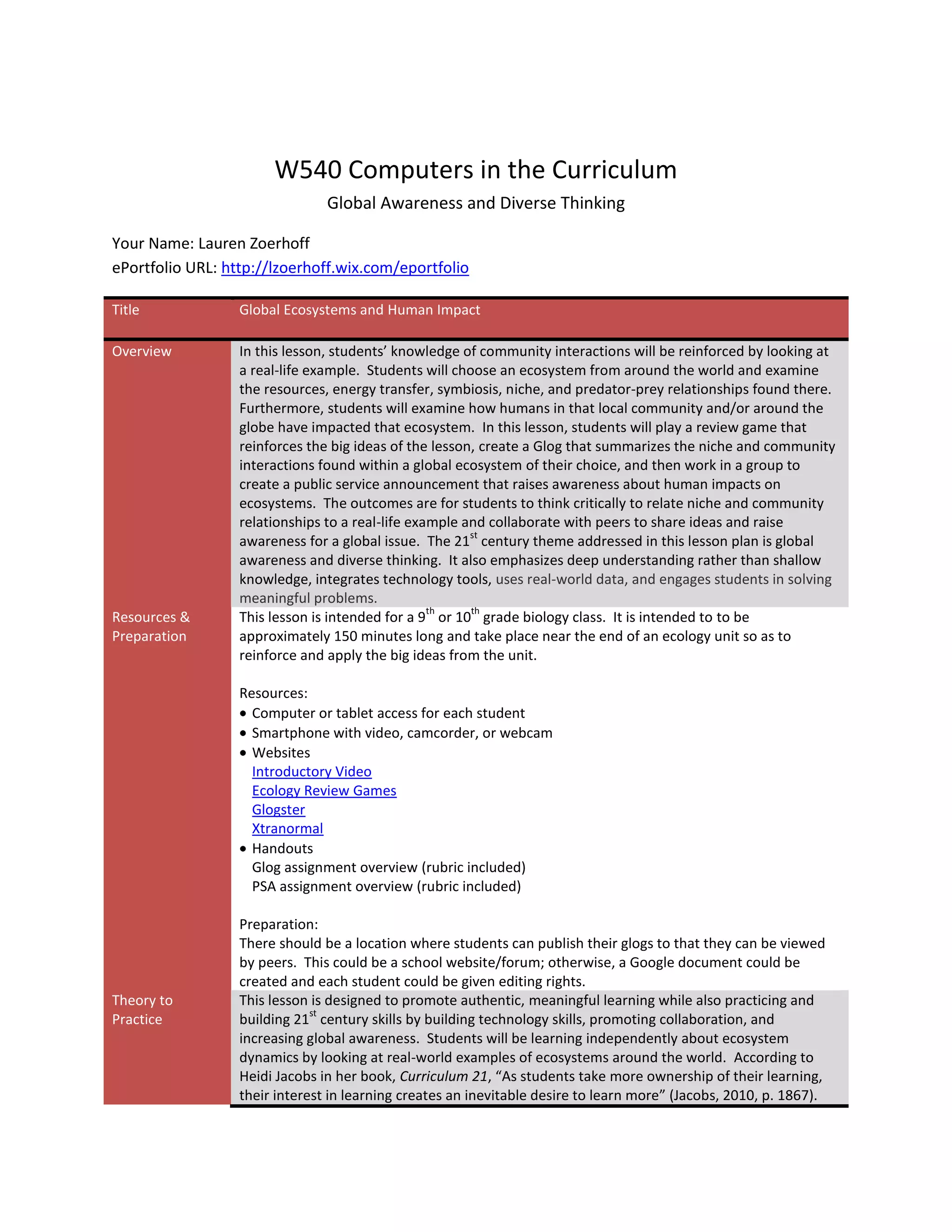 This lesson plan aims to teach students about global ecosystems and human impacts through three main activities. Students will first create an online "glog" summarizing the niche and community interactions within a global ecosystem. They will then play online ecology games to reinforce lesson concepts. Finally, students will work in groups to create a public service announcement raising awareness about how humans have negatively impacted global ecosystems. The goal is for students to make real-world connections and collaborate on solving an environmental issue.
