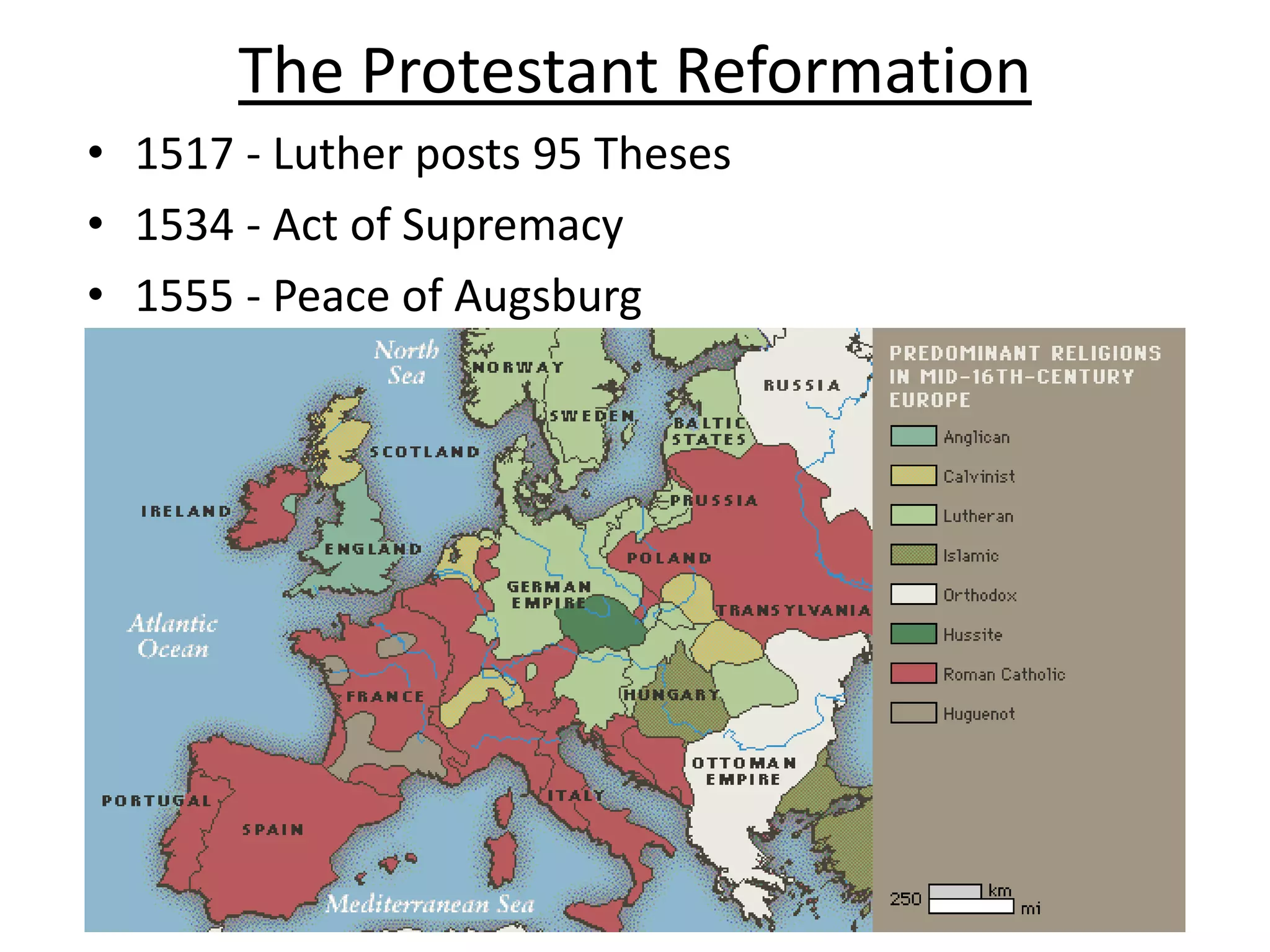 The document outlines the key events and figures of the Protestant Reformation, starting with Martin Luther's 95 theses in 1517 and culminating in significant outcomes like the Act of Supremacy in England in 1534 and the Peace of Augsburg in 1555. It highlights the emergence of various Protestant sects such as Lutheranism and Calvinism and the social and political repercussions of these religious shifts, including the English Reformation and conflicts like the Peasants' Revolt. Additionally, it discusses the invention of the printing press by Johannes Gutenberg and its transformative impact on literacy and the dissemination of ideas throughout Europe.