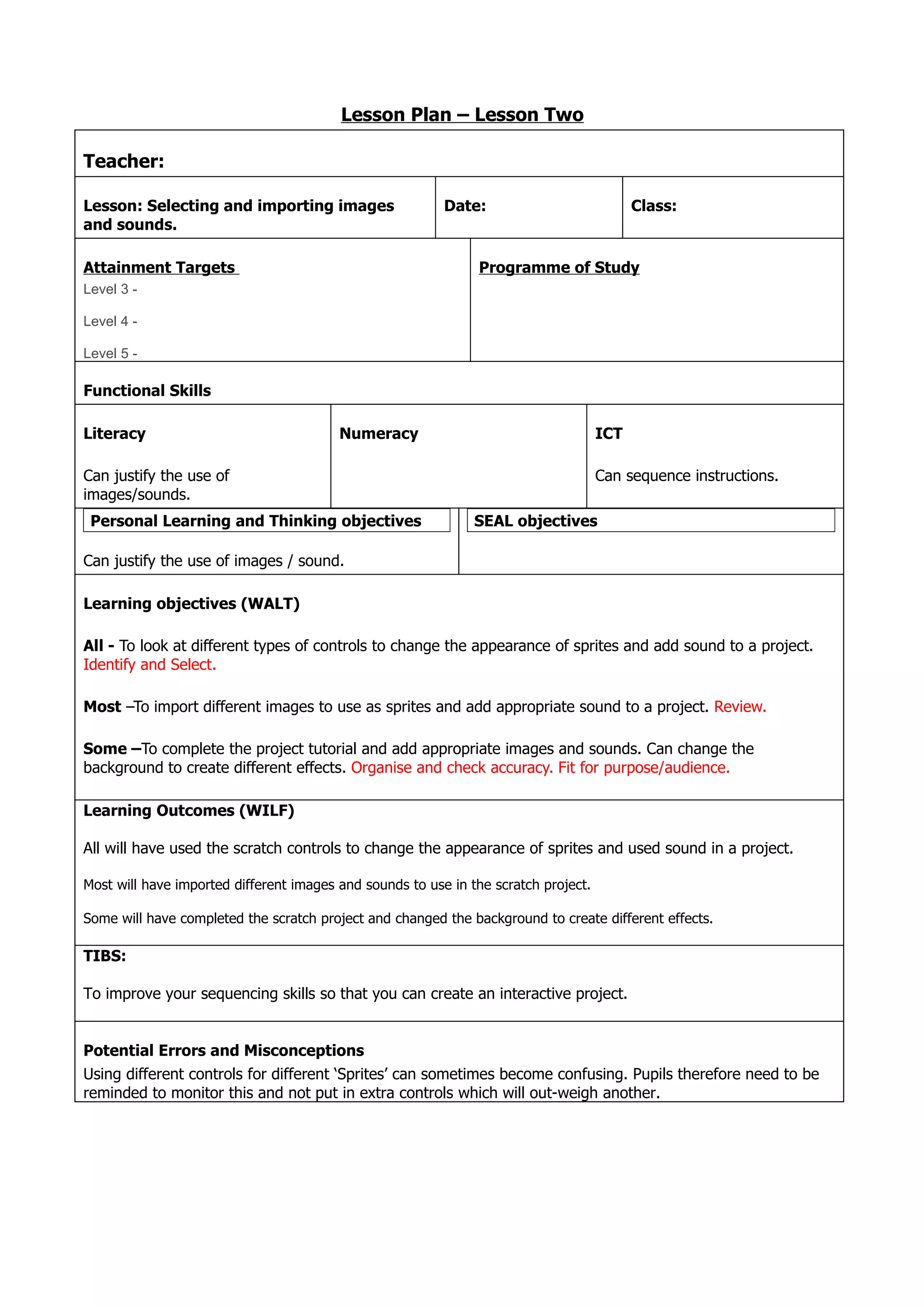 The lesson teaches students how to import images and sounds into Scratch projects to create different effects, with the learning objectives being to look at controls to change sprite appearances and add sound, import different images and sounds, and complete a tutorial project adding images and sounds while changing the background. The lesson involves students matching pictures to words, reviewing a teacher project, working through a PowerPoint tutorial, and providing feedback on an improperly designed project.